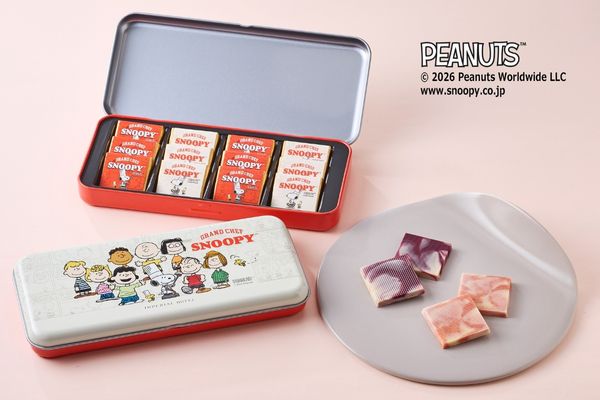 帝国ホテル 東京のオリジナルキャラクター「料理長スヌーピー」とピーナッツの仲間たちをあしらった缶に、カラフルなマーブル模様が華やかなベリー系のプレートチョコレートを2種類詰め合わせました。